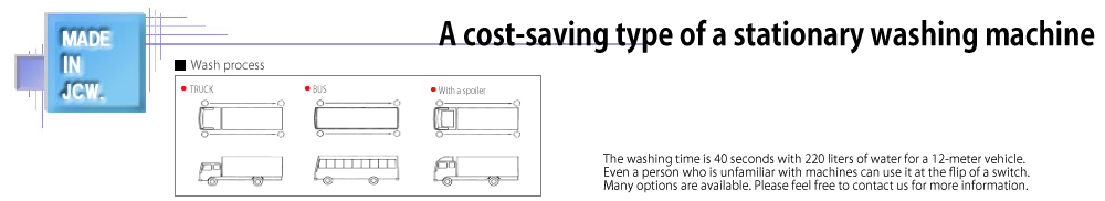 This is a long-selling washing machine to wash the sides of a vehicle with two units of brushes. The footprint is the smallest among the stationary washing machines. It has been frequently improved since its debut, and we guarantee the superb structure and features. The sides of a vehicle are fully washed with the newly developed brushes and the new control system. Washing can be performed through the whole process vehicle washing machine controller which controls washing time, volume of water, and washing spots. Also, molten zinc plating is used for the frame of the machine, and aluminum‐zinc alloy‐coated steel sheet is used for the outside plating, as a standard specification for long-term hard use. A variety of options are also available in response to specifications of users such as a card system, a coin system, a POS system, and a failure data logger.