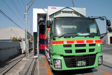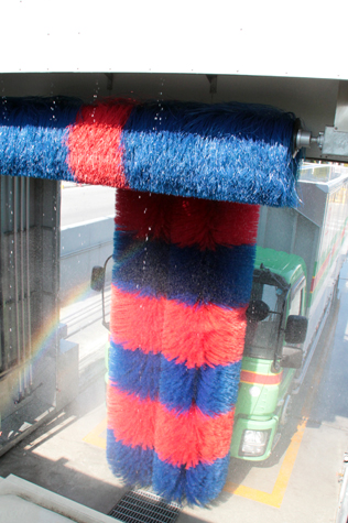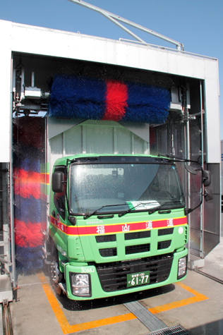 This is a washing machine to wash the whole circumference (the front, sides, and rear) of a vehicle with three units of brushes. The newly developed brushes and the new control system make it possible to fully wash the front and rear of a vehicle, not to mention the sides. A system unit is equipped with the machine as a standard specification to wash the tilted surfaces of the front and rear of a new-model vehicle. Washing can be performed through the whole process vehicle washing machine controller which controls washing time, volume of water, and washing spots. Also, molten zinc plating is used for the frame of the machine, and aluminum‐zinc alloy‐coated steel sheet is used for the outside plating, as a standard specification for long-term hard use. A variety of options are also available in response to specifications of users such as a card system, a coin system, a POS system, and a failure data logger.