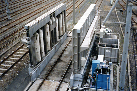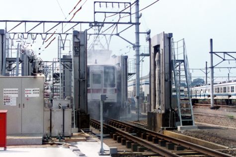 This is a fundamental washing system(Train Wash Plant) for railway carriages consolidating all the know-how accumulated since our foundation. It is a stationary type, and can be installed in a small footprint. Moreover, a carriage can be brought in from either direction for the washing process, thus the system can be installed at a place which was considered not possible in the past. The whole circumference of a carriage up to the shoulders, to say nothing of the sides, is fully washed. The new control system and special mechanism perform the washing by precisely correlating to the shape of a carriage without any need for manual washing.